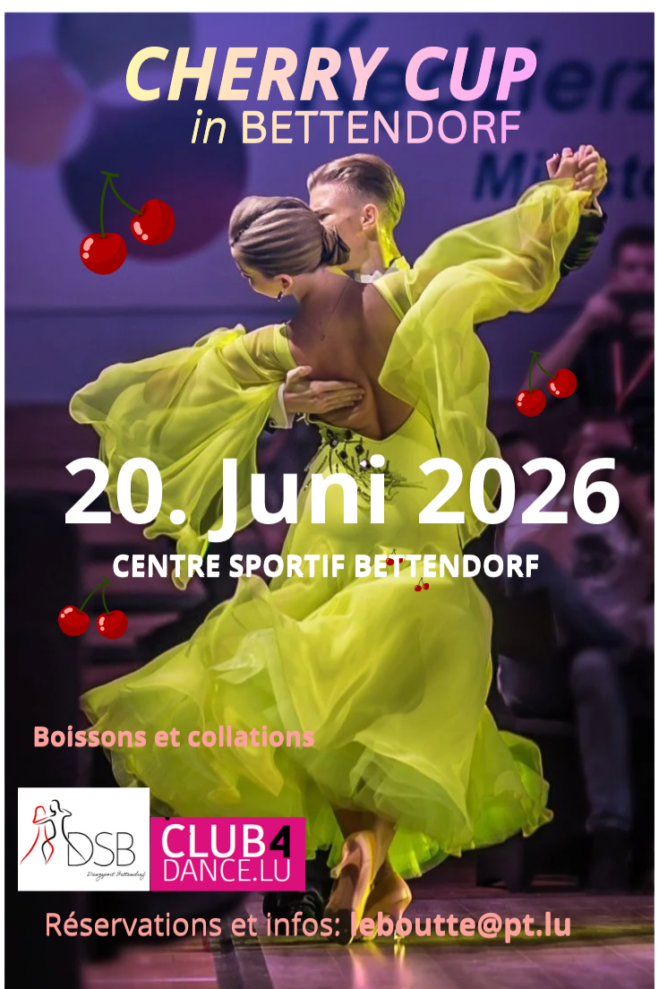 Heimat luede mer Iech, är Frënn a Famill, op déi 2. Editioun vun eisem internationalen Standard- Danzturnéier, la CHERRY CUP 2026 den 20. Juni zu Bettendorf an.